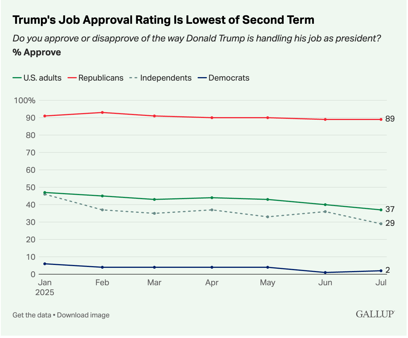 According to a new Gallup poll, President Donald Trump’s approval rating has plummeted to 37% six months into his second term, marking the lowest point of this term and nearing his all-time low of 34%. This decline is primarily driven by independents, whose support has dropped 17 points since January to a mere 29%.
